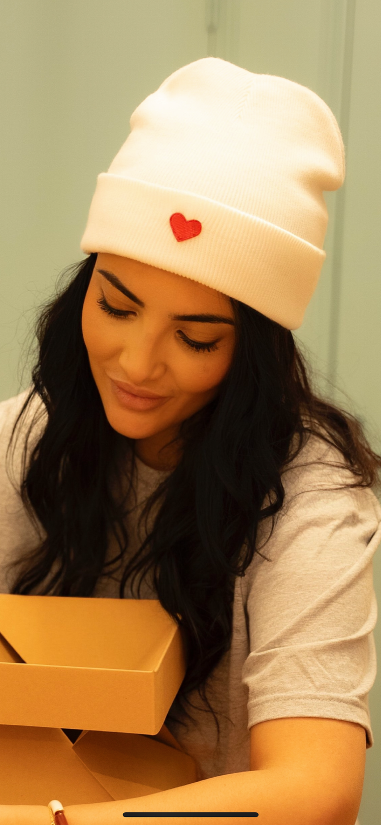 ❤️ Notre bonnet blanc écru à coeur rouge est l'accessoire qui fait toute la différence