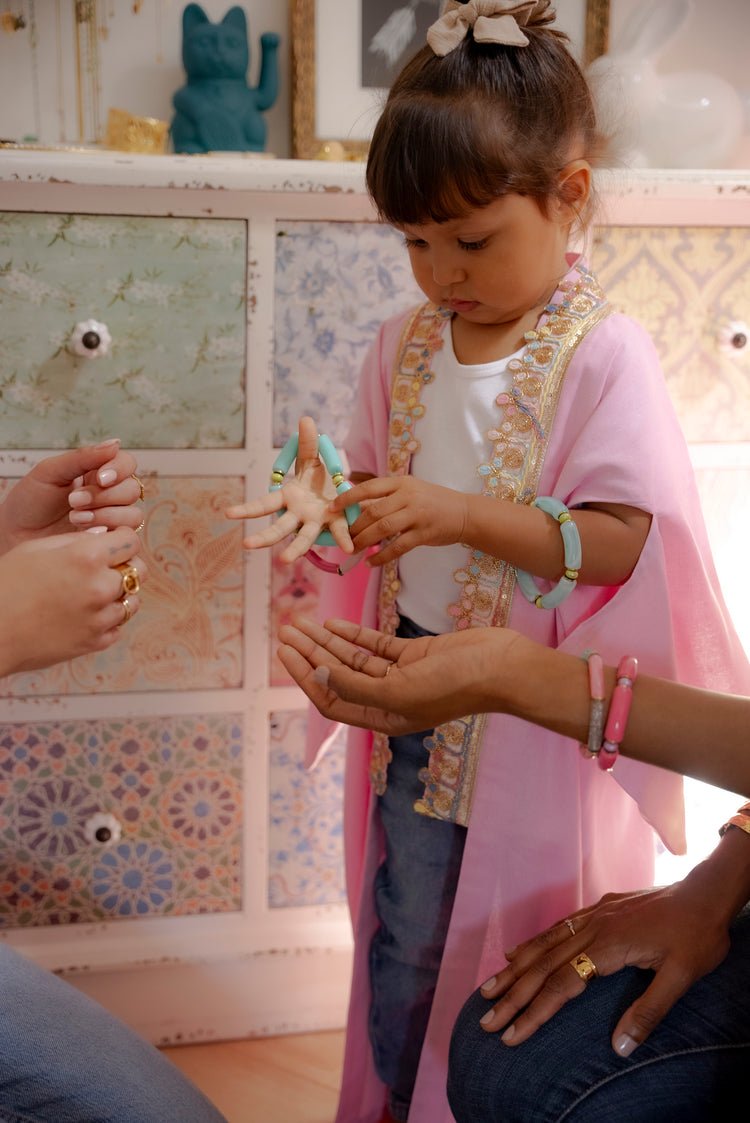 Le kimolove rose des petites filles a été fabriqué main avec amour et minutie à Marrakech. Pour une occasion, il fera toute la différence grâce à sa jolie couleur chamallow, sa broderie au fil doré, sa coupe élégante et son tissu plein de légèreté.
